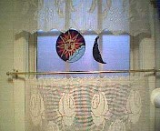 A cool Christmas 2002 gift from my cool SIL Jo was a cobalt blue glass crescent moon ornament that graced my kitchen window alongside a not-quite-as-cool sun suncatcher I bought at the drugstore. They saw me coming; it was right there by the pharmacy and they knew I'd need something shiny to look at while I waited for my prescription to be filled.